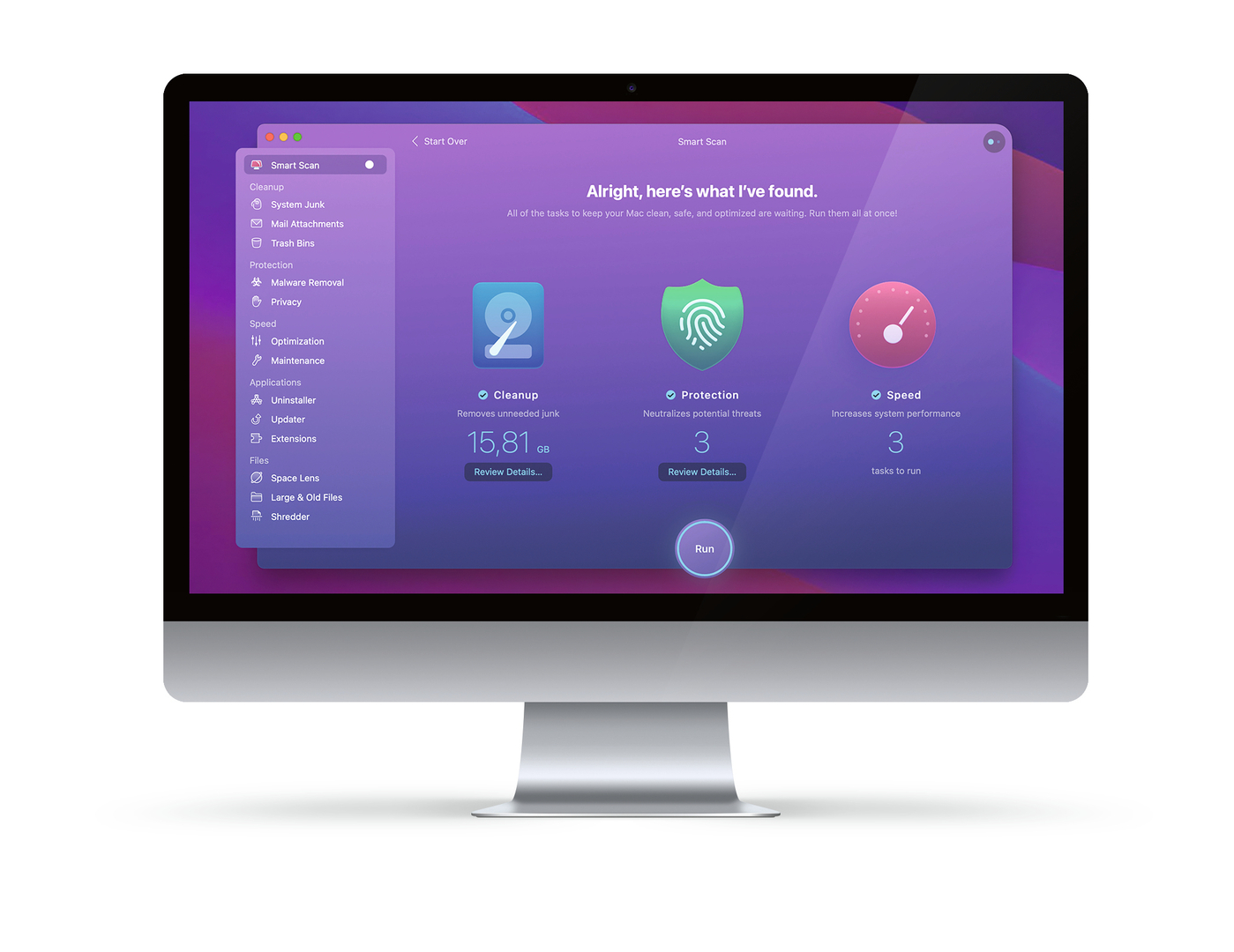 The macOS application CleanMyMac X removes data junk from Macs, thereby freeing up memory and improving performance. It is characterised by a user-oriented design with a sidebar that allows easy navigation through the application. While analysing and cleaning the system, a warm colour spectrum in shades of pink and blue informs the user of the status in a clear and appealing manner. Parallax animations, interactive hover effects and atmospheric sounds turn the optimisation process into a sensual experience.