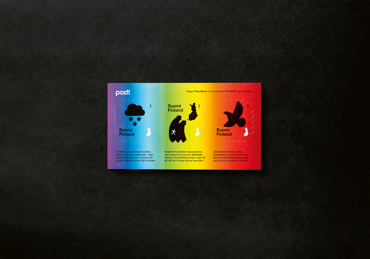 The Post of Finland commissioned the design to make a series of stamps on climate crisis, which are printed using heat-reacting ink. The stamps depict snowy winters, limited immigration and a certain bird endemic to Finland – the current situation in Finland. When heated, the stamps reveal the future state of possible consequences of the climate crisis. They show snow turning into rain, mass immigration due to heat-ruined areas further south, and the extinction of many of Finland’s endemic species. A sense of urgency was added with the die-cutting and colour scale of the stamps.