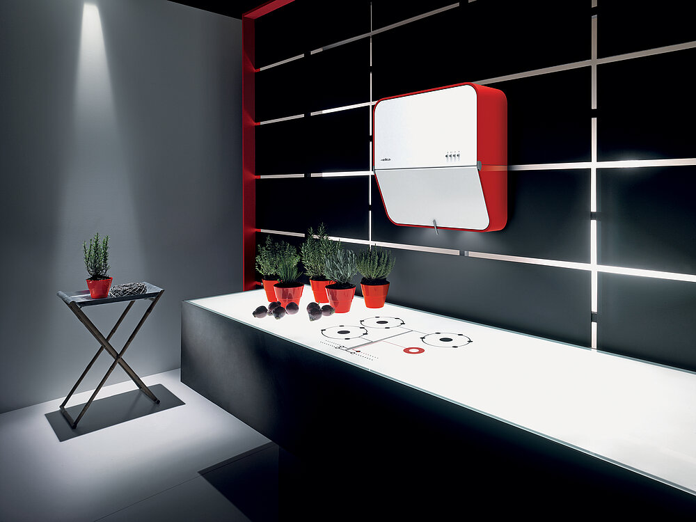 Clip is an extractor hood which is characterised by its simple geometry and small dimensions. Its rectangular shape is softened by the rounded corners, while the unusual outline is accentuated by a slim frame in a contrasting colour. The dimensions of the side parts and the swinging element which opens to the front, achieve a minimum depth. For this product development, the technical features have been reduced in size.