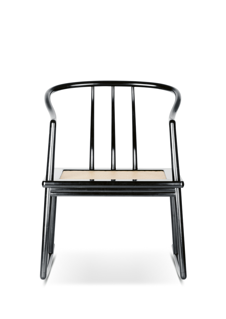 The design of the Cloud rocking chair combines the traditional shape of a piece of Chinese furniture with a rounded backrest with elements of a Western rocking chair. The tripartite back, whose curvature follows the natural shape of the human body, is assembled using wedge-shaped dowels. The seat is made of rattan woven by hand, which is very elastic and furthermore feels cool in summer and warm in winter. With its exquisite and delicate appearance, the chair adapts well to a range of different living environments.
