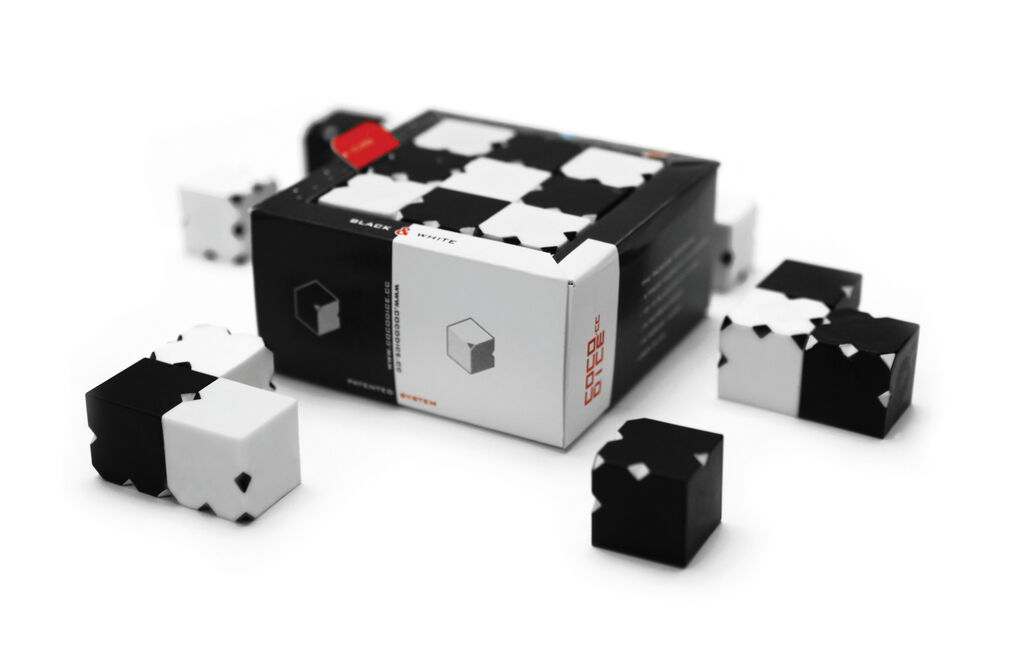 Cocodice, short for Corner Contact Dice, is a game for both large and small children aged five and up. It poses different challenges for each age group: for younger children, Cocodice is a spatial game, training depth perception and sense of touch, while for older children it presents combinatory, mathematical and geometric tasks that are fun and also encourage logical thinking. Integrated magnets ensure that the individual dice hold together and can be interlinked, with black holding to white and white to black. Connections are thus created that do without mechanics while arousing curiosity. Cocodice furthermore represents a reinterpretation of traditional games like Domino, Jenga and the legendary Rubik’s Cube. Markings that can be felt with fingers allow even blind people to play with Cocodice – added value that fosters respect for one another within society.