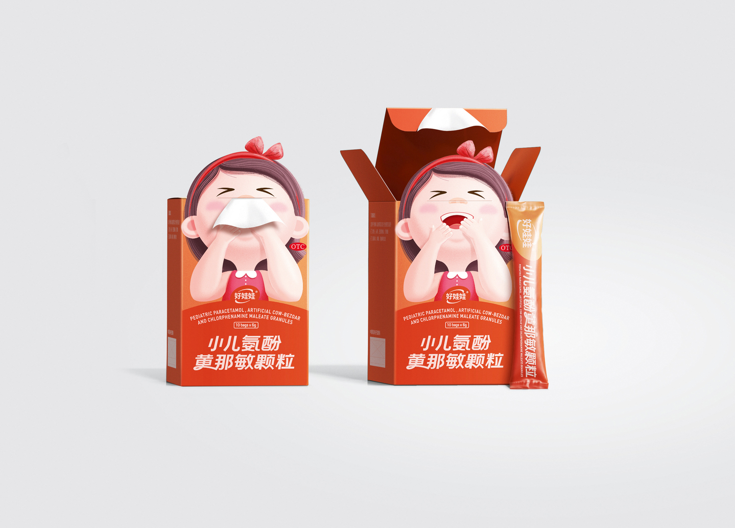 This pharmaceutical packaging catches the eye with the key visual of a child wiping its nose. When the user opens the box, the closing tab, which represents the tissue in the illustration, is pulled out. What remains is the image of a happy child. This surprising transformation brings the message to the point that taking the medicine leads to a quick recovery. Thanks to its expressive style, the packaging is easily identifiable. It also increases the chances of appealing to a wide target group by showing children of different sex and complexion.
