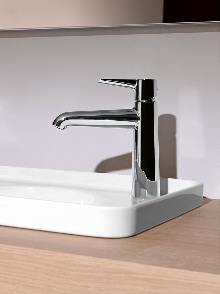 Body and levers of the Val tap series taper towards the front. This lends the single-lever mixers a light, slim appearance. The design consciously does without a rosette to simplify the cleaning of the tap and ceramics. The Val product family includes a raised tap for washbasin bowls, a twin-hole wall outlet, as well as models for the bathtub and shower. They all feature the same finely tuned design language and are equipped with an energy-saving cold start function.