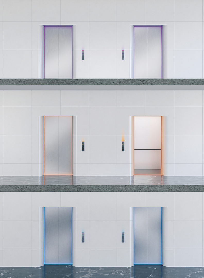 When returning to their parking lot, passengers will naturally find the parking floor by recalling the colour of their floor and checking the coloured buttons of the elevator. The display of the input device encountered inside and outside the lift uses an intuitive and interesting GUI that shows directions. The colour changes naturally as the floor moves, allowing passengers to sense the movement of the space and arrive at their destination.