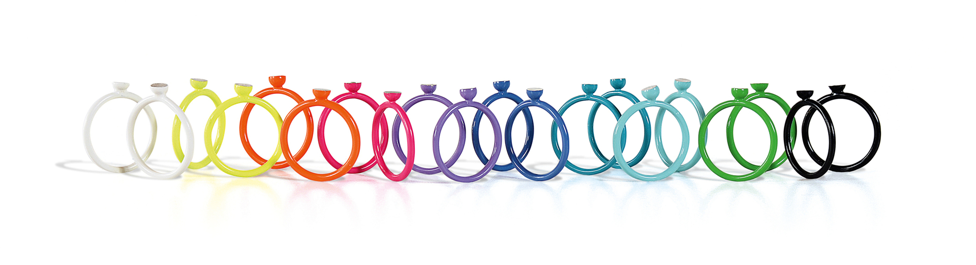 Under a robust powder coating, Colourfool hides a delicate silver ring, which reveals its silver secret at the top of the ring. There, it is either matt with a sparkling brilliant-cut diamond or highly polished. Ten different colours and the various precious metal surfaces offer the wearer a wide range of choices, from simple minimalist to playfully colourful. Thanks to its coating, the ring is also suitable for sufferers of metal allergies.