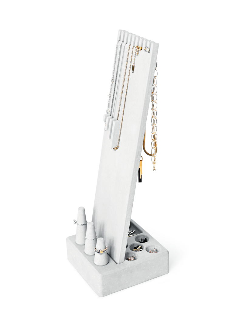 The jewellery stand of plain grey concrete ensures order and a clear overview. Thanks to its smart subdivisions, necklaces, rings and earrings can be stored neatly. There is room for up to ten necklaces, hanging from the notches on the slanted centre wall. Five hemispherical recesses are provided for ear jewellery. The cone-shaped modules, which hold up to 15 rings, are inspired by tetrapods used as coastal wave breakers and emphasise the modern look of the practical organizer.