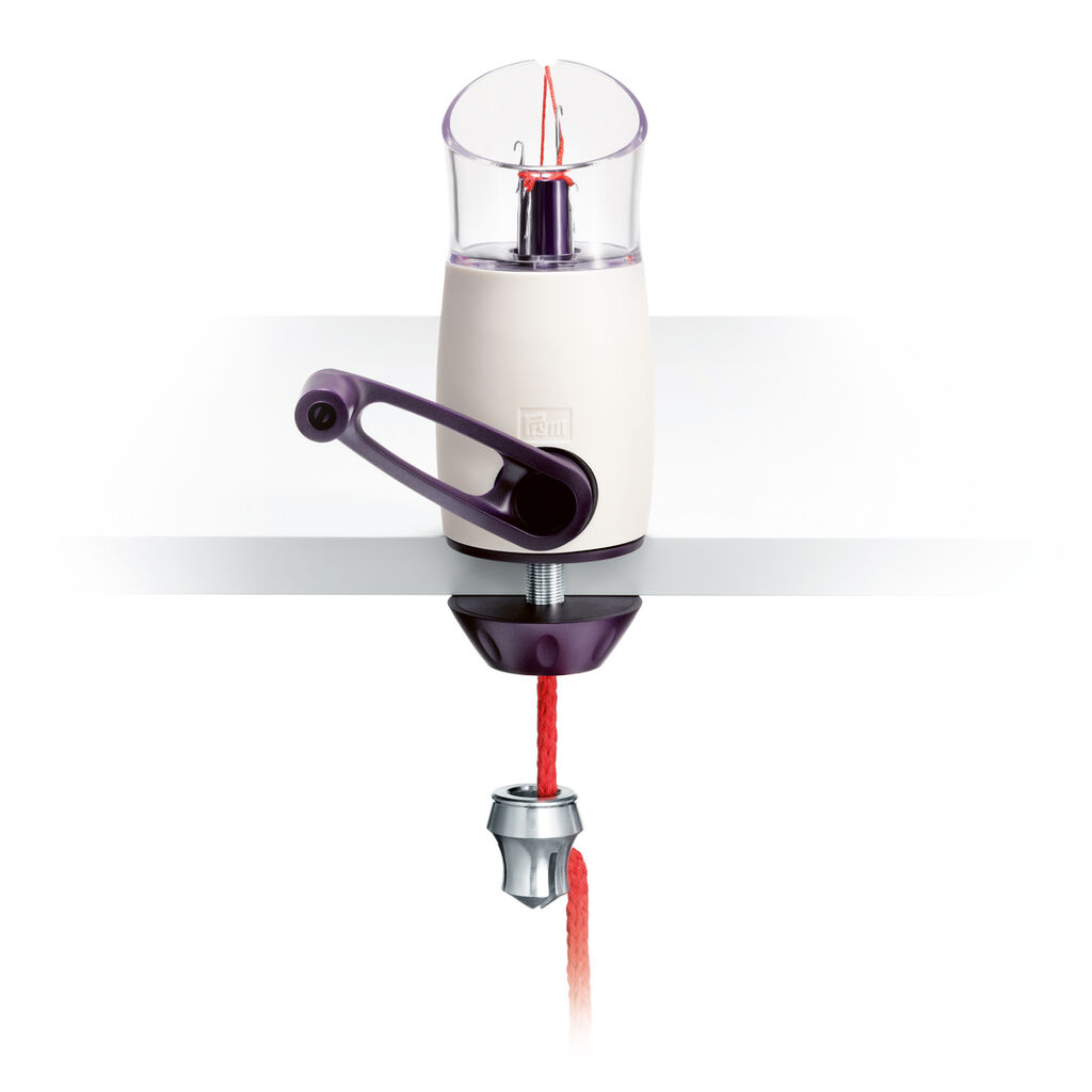 Comfort Twist simplifies the production of long knitted tubes. The yarn is threaded through four hooks. A weight is then attached to the lower end, which is repeatedly moved upward and fixed in place to provide the necessary tension on the knitted tube. Cranking creates an evenly knit fabric. Comfort Twist can be held in the hand or attached to a table using the integrated screw clamp. Both clamp and weight are easily attached to the utensil for safe storage.