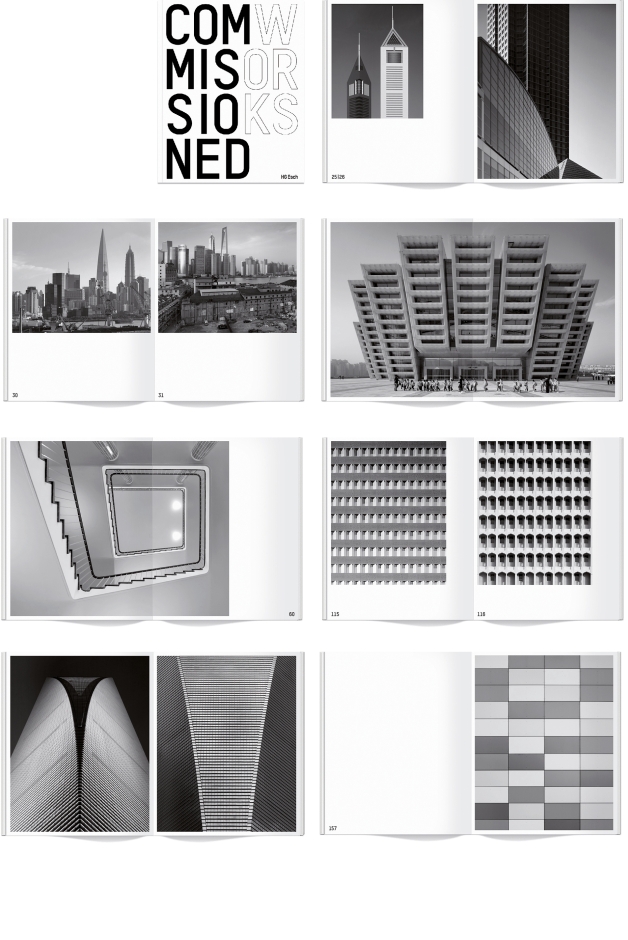 The exhibition “Commissioned Works” and the catalogue of the same name show the works of architecture photographer Hans-Georg Esch, who produced them for national and international architecture firms during more than 20 years of his career. The layout with its monochrome colour scheme and the strict composition with only a few variations treat each project equally and put the works into an artistic context. An eight-page fold-out catalogues all 169 images.