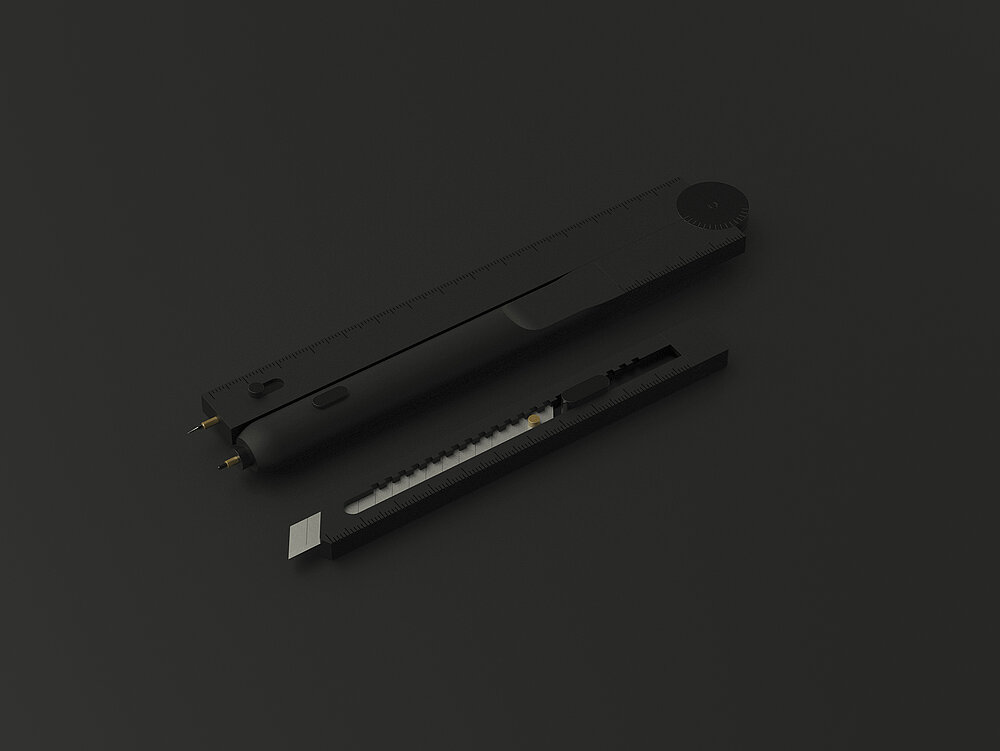COMPACT STATIONERY is a stationery set with an effortless sliding system. Its components can be assembled to create a ruler, a compass, a pencil or a craft knife. This set of compact tools saves desk space and are highly portable. Its design is centred around the lifestyle of an urban working individual who pays attention to details and minimises unnecessary clutter. The language for the tools provokes confidence, keeping only the most important details.