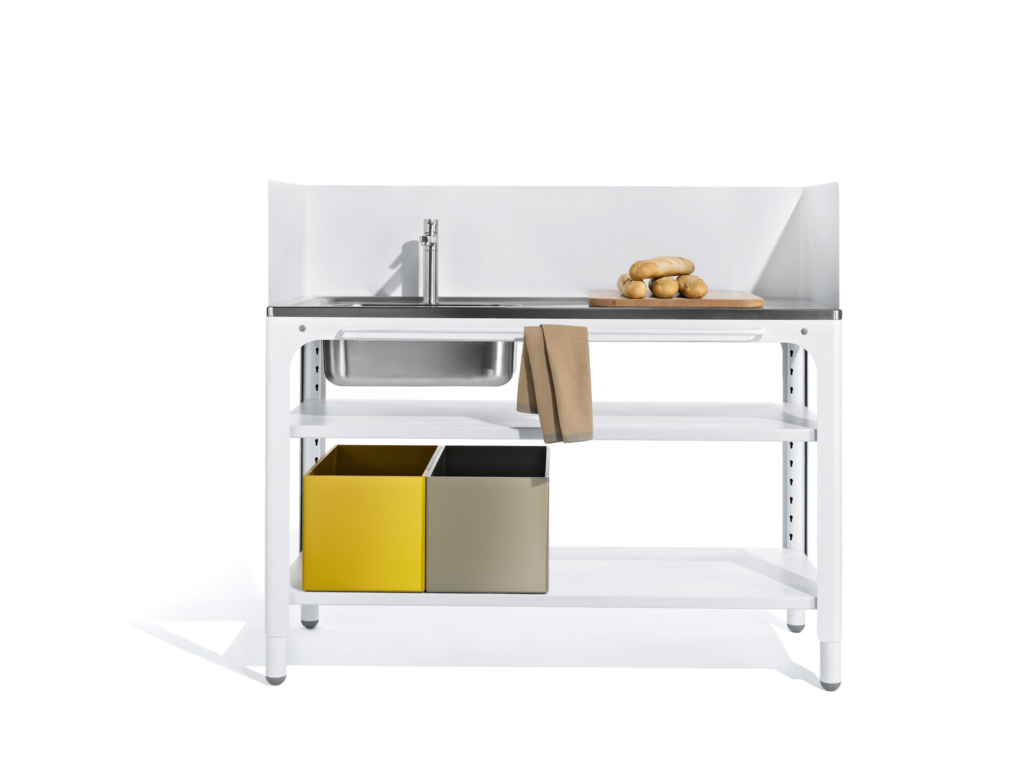 This mobile kitchen flexibly adapts to users’ lifestyles. Whether as a standalone solution or in combination with a traditional kitchen unit, the modules can be arranged as desired. The system is based on five modules: worktop with integrated hob, sink centre, butcher block, storage rack and technology tower. The stainless steel base elements can be disassembled. They feature grid holes for the flexible positioning of structural and plain shelves. A simple plug-in principle allows easy assembly and disassembly without tools.
