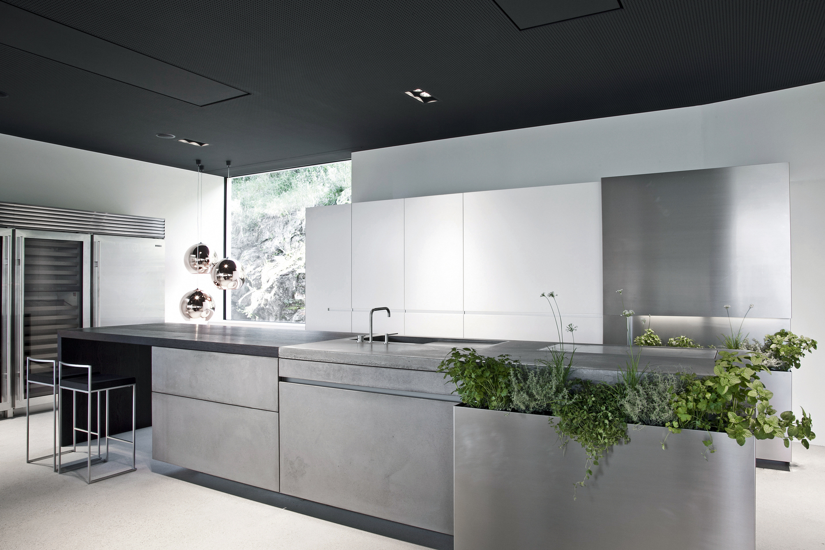 This innovative kitchen is produced from only 8 mm thin concrete, which is stable but at the same time light enough for the production of furniture. Concrete is both heat resistant and food-safe and therefore very suitable for the use in kitchens. The appealing surface corresponds with the well thought out interior, which is made of stainless steel and high quality wood. An integrated solid wood table and two herb patches are not only functional elements, but they also emphasise the characteristic look and feel of the concrete.