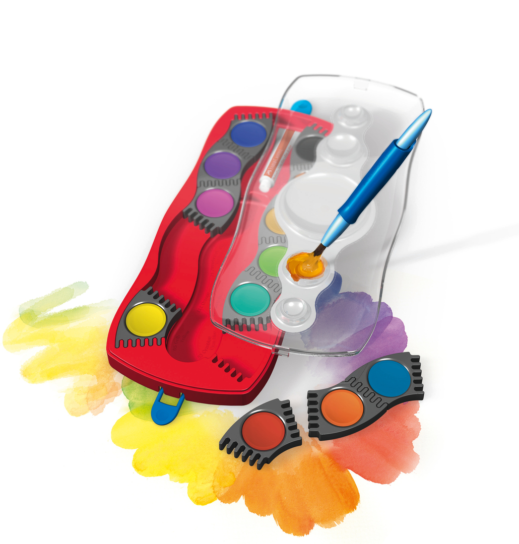 The paint cups of the Connector Paint Box are arranged according to a playful, interlocking principle, like a jigsaw puzzle. The individual parts can be compactly interlinked for storage, or in various other ways while in use to inspire the child’s imagination and creativity. This in turn offers an educational benefit: paint cups connected together, for instance in the shape of a circle, promote the playful learning of colour relations or contrasts. Their relatively large base lends the individual paint cups stability, so they may be used on small desks as well. A removable, see-through lid, which also serves as a mixing pallet, allows for working with the templates printed underneath the lid and for coordinating colours accordingly.