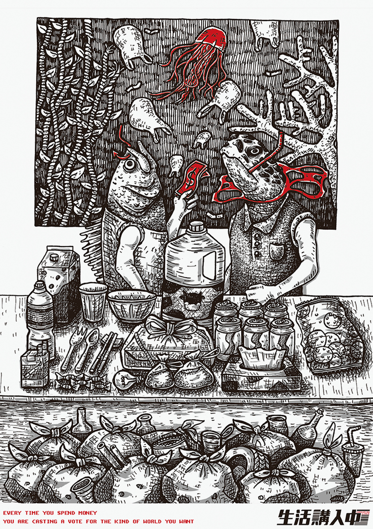 Inspired by Leonardo da Vinci’s painting “The Last Supper”, this poster series uses a long table as a setting for depicting the excesses of a consumerist lifestyle. With elaborately developed, partly surreal details, the illustrations highlight the impact of self-centred shopping habits on the environment. The contrasting colour scheme of black, white and red underlines the urgency of the message. Thus, the drawings emphatically draw attention to the fact that each consumer has the choice of behaving differently.