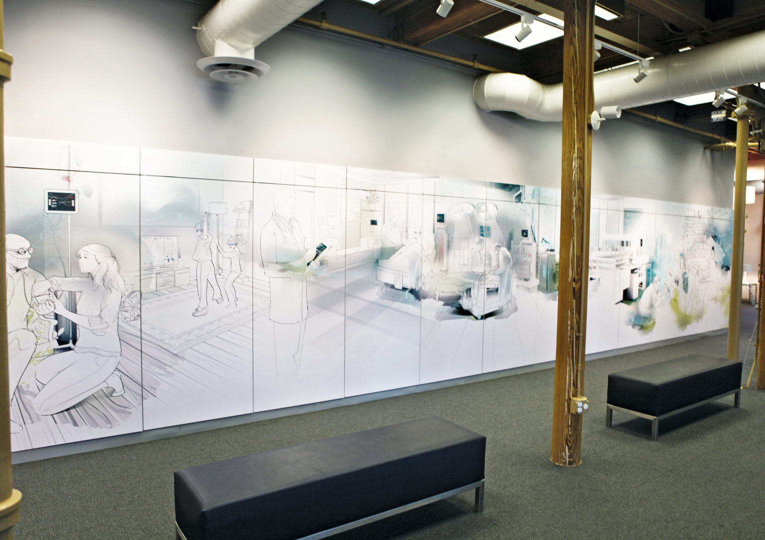 Permanently and prominently displayed in the lobby for all visitors to see, this wall mural showcases the work of the Advanced Systems division of Continuum, a global design and innovation consultancy. The illustration demonstrates the human-centred philosophy of Continuum Advanced Systems by presenting exemplary work from the realms of health care and medicine. The mural is mounted on a customised mechanical wall with individual turning panels, and each segment of the picture corresponds to a product featured on the other side of the panel.