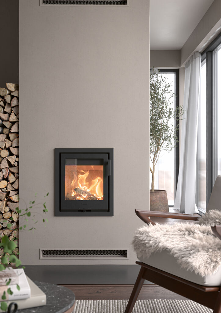 The compact Contura 130 wood burning stove makes it possible to fit even smaller rooms with a cosy heat source. The modular concept allows for flexible configurations of the firewood compartments. Even the firebox with its generous viewing window can be set at the desired height. Chamfered edges and geometric lines give the stove a clean-cut look so that it can be installed as a stand-alone feature or integrated into various environments.