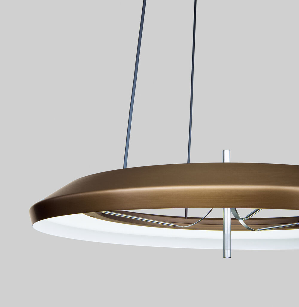 The Conversio LED pendant luminaire features a mechanical light control: the interior ring, which contains the circular light source, interacts with the exterior reflector ring via an intelligent mechanism, which directs up to 95 per cent of the warm LED light upwards or downwards, depending on the positioning. At the centre setting, 75 per cent of the light is directed at the table and 25 per cent towards the ceiling. Conversio is available with various anodised layers in different colours, lending the lamp a sculptural appearance even in daylight.