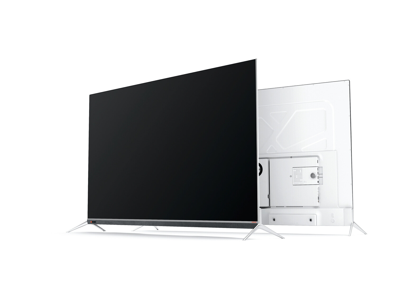 The Coocaa T55 has a modular construction, allowing for easy replacement of both the mainboard and the sound system. In this way, the screen can be supplemented with modern components time and again and used over the entire span of its life cycle. A timeless design also contributes to this: the frame of the merely 7.9-mm-thin screen consists of aluminium and rests on elegantly angled metal feet. At the bottom, the frame is rounded off with a linen band available in different colours.