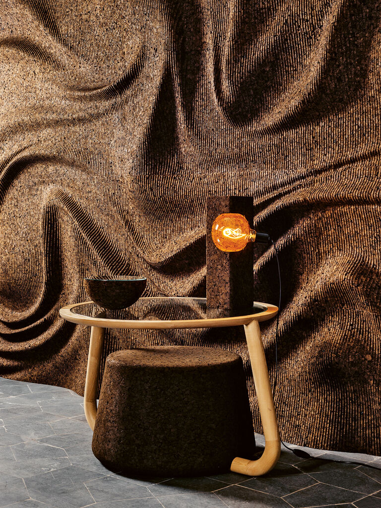 CorkWirl is a wall panel with generative patterns inspired by biomimetic structures. Twirl movements generate organic and fluid shapes. The low-tech material of sustainable cork granulate is produced in a natural high-tech process in the course of which water vapour is injected through pellets using high pressure, creating a wide variety of shapes and patterns by means of algorithms. In addition, this attractive panel has excellent thermal and acoustic properties.