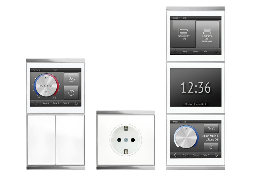 The Corlo switch series is made convincing by its high-quality glass and chrome surfaces, no-holds-barred manufacturing quality and durable materials. What is new is the touch display that, with a standard grid size of 71 mm, only takes up one grid unit/socket. The touch surface is used both as a switch and for the automatic adjustment of building services engineering. The mechanical push buttons feature an integrated thermometer for room climate control. Solar, wireless push buttons with a built-in buffer battery can be mounted without the need of a socket and be placed wherever required.