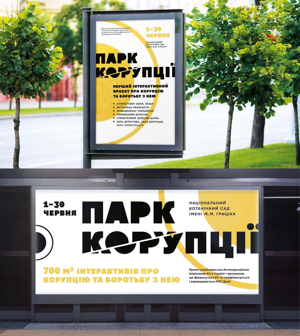 Initiated by the EU Anti-Corruption Initiative, Corruption Park came about as a creative attempt to approach the topic of corruption in an appealing and informative way. The colours used in the corporate design are particularly striking: the gold and black colour palette, associated with corruption in Ukraine, is contrasted with white and silver, colours which stand for freedom and transparency. A vigilant eye is indicated with filled circles as a symbol to counteract corruption. The eye is an important graphic element in all media, while the separating cut in the typography visualises the destructive power of corruption.