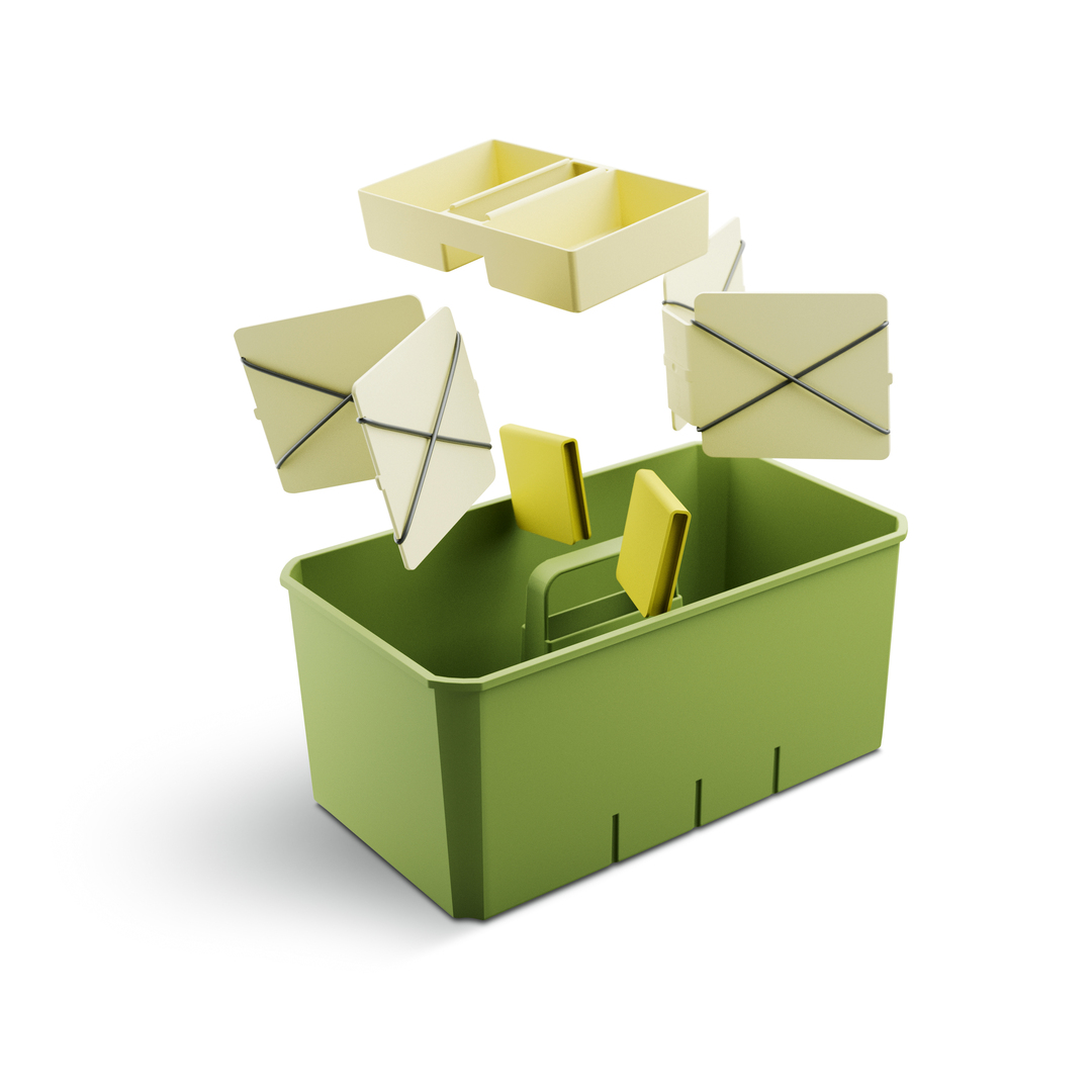 This modular utensil box, made of ABS plastic, has been designed to store kitchen utensils, office supplies, tools, sewing kits, toys or gardening equipment. The base is a sturdy container with an integrated carrying handle and features U- and V-shaped dividers as well as a tray for small parts, which can all be securely locked into place. In addition, the items to be stowed can be held in place by crossed rubber bands. Cox Work is available in four harmoniously coordinated colours for individual combination.