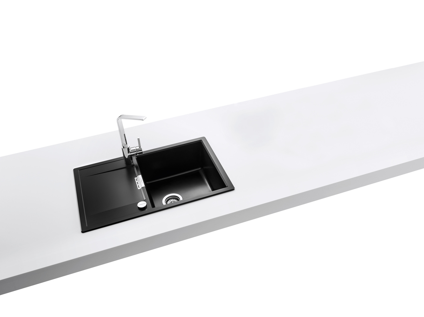 This compact kitchen sink is characterised by clear lines and corners, a prominently positioned overflow and surfaces that are pleasing to the touch.