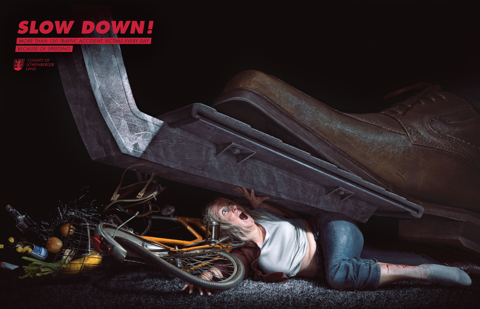 The German county of Löwenberger Land needed to raise awareness of the increasing number of traffic accidents in the area that involved pedestrians. Most of these accidents were caused by motorists speeding in town. Resorting to drastic visual imagery, the Crushing Pedal campaign highlights the threat that speeding poses to pedestrians. The gas pedal, therefore, was turned into a strong key visual: pressing it too hard has a direct impact on the people situated below it in the illustration. Billboards with these motifs were placed next to high-risk roads in the Löwenberger Land.