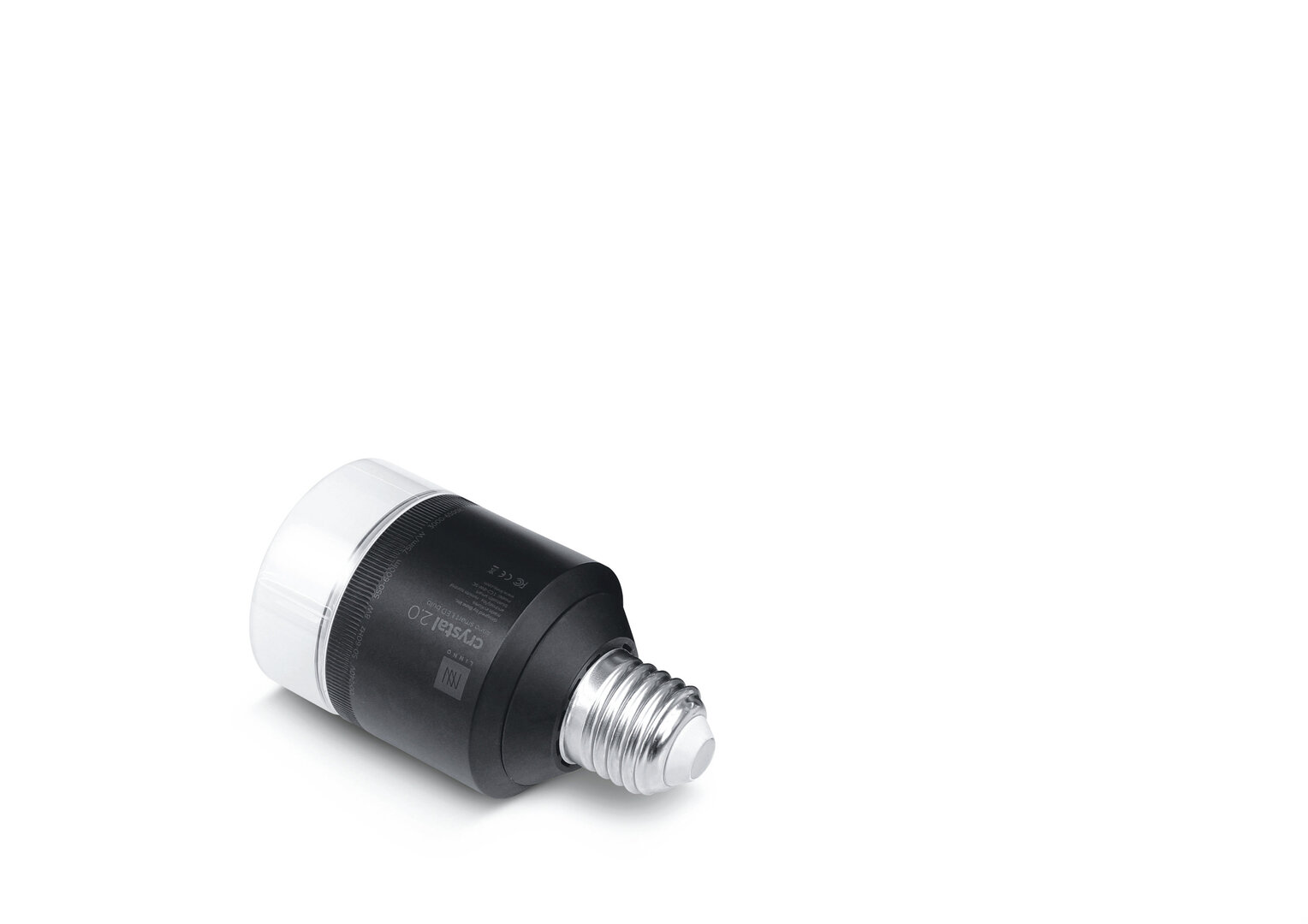 The design of Crystal 2.0 follows the objective of combining the functionality of a controllable LED lamp with the visual impact of traditional incandescent bulbs. Reminiscent of camera lenses, the diffuser features a unique aesthetic. The light beam of the lamp can be changed from narrowly focused to widely diffused. This is controlled optionally via a remote control or a downloadable app, which users can also use to adjust brightness, colour temperature and up to 16 million colour nuances.