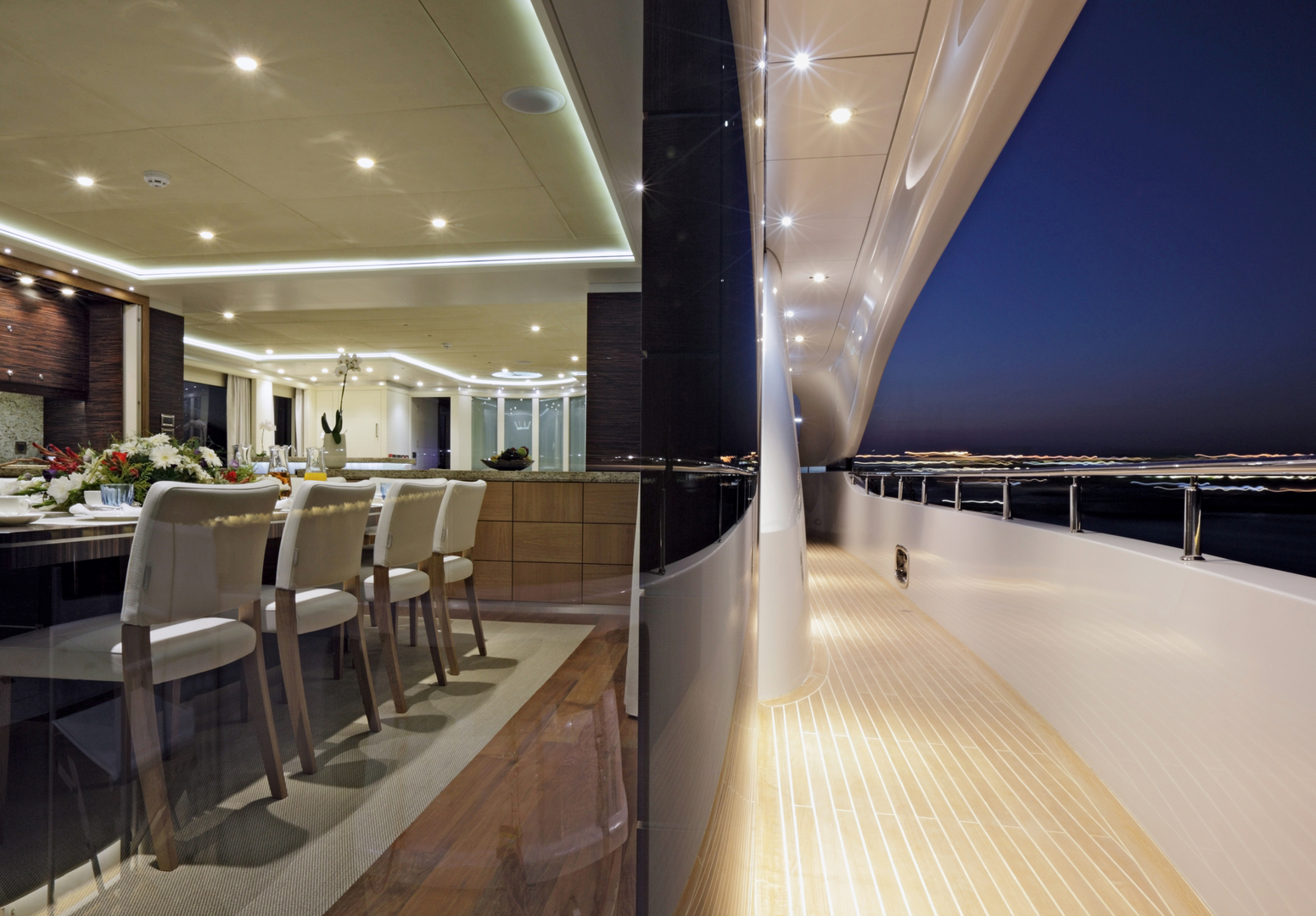 The exterior of this 34-metre luxury catamaran yacht captivates with its impressive and slim-lined appearance. Clear, gently curving lines and surfaces separate the four individual decks visually while simultaneously uniting them to form a harmonious, placid unit. The interior concept of the main deck with its large panorama windows offers, thanks to a modular system, great flexibility of layout for the six double cabins, each with en-suite bathroom. The yacht is constructed of lightweight and sturdy hybrid carbon-fibre composite.