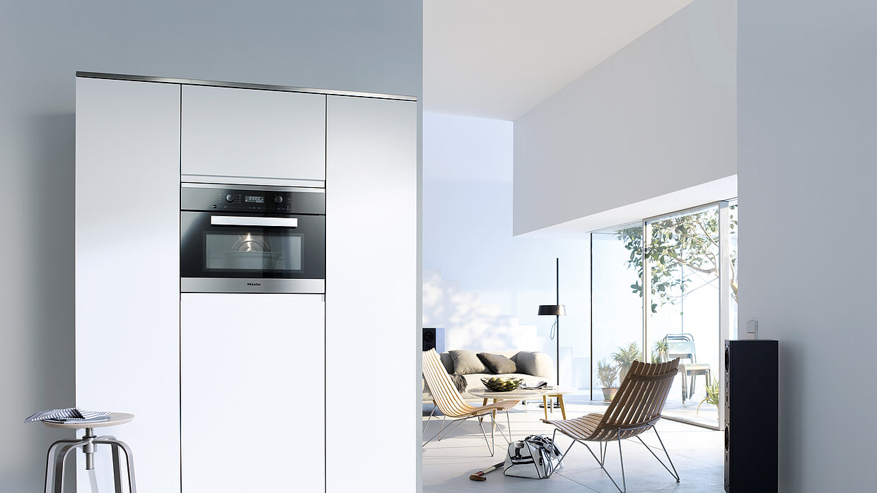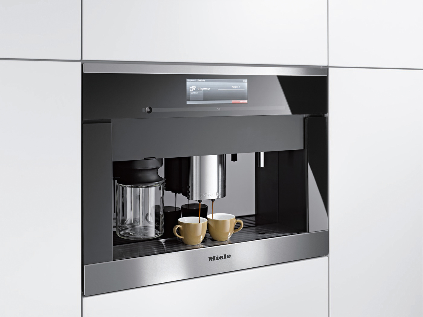 This built-in fully automatic coffee maker with whole coffee bean system is available in stainless steel, Obsidian Black, Brilliant White and Havana Brown. Its fully automatic CupSensor adjusts the coffee spout at an ideal distance to the height of the cup placed below. The One Touch for Two function allows the simultaneous preparation of two coffee specialities. With one movement, the milk jar can be inserted from the front or removed thanks to the EasyClick system.