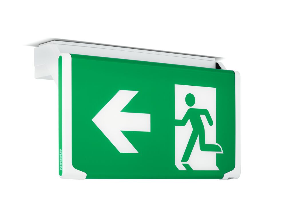 D-Sign is a newly interpreted emergency lighting and aimed at a minimalist and stylish look. Inspired by the contour of a smartphone, the light sign features gently rounded edges. The product solution is suitable for both ceiling and wall mounting, while a slide-in power connection simplifies installation. High luminosity with a uniform light distribution in combination with a flash-alert light ensures the necessary safety in buildings.