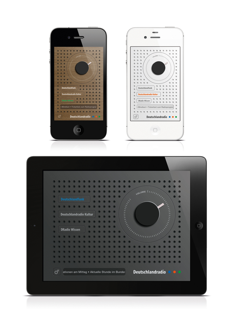 The concept of Das DRadio focuses exclusively on the purpose of listening to the three radio stations broadcast by Deutschlandradio. The interface of the app is designed to visually integrate the entire smartphone or tablet and turn it into a radio. Depending on the colour of the respective device, users can choose between a black or a white surface and thus personalise the app accordingly. For a more traditionally minded target group, there is also the option of selecting a wood-like surface.