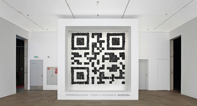 The presentation on the occasion of the award “red dot: agency of the year 2010” in the red dot design museum in Essen was intended to make people enthusiastic, integrate the exhibition location Zeche Zollverein and at the same time reflect on the topic of “communication”. An oversized QR-Code made from coal, titled “COMMUNICATION – TODAY’S RESOURCE”, symbolised a bridge between the industrial and the communication era. When the visitor took a picture of the code with his or her smartphone, an exhibition room appeared on the display, simulating the physical presence of the BBDO works.