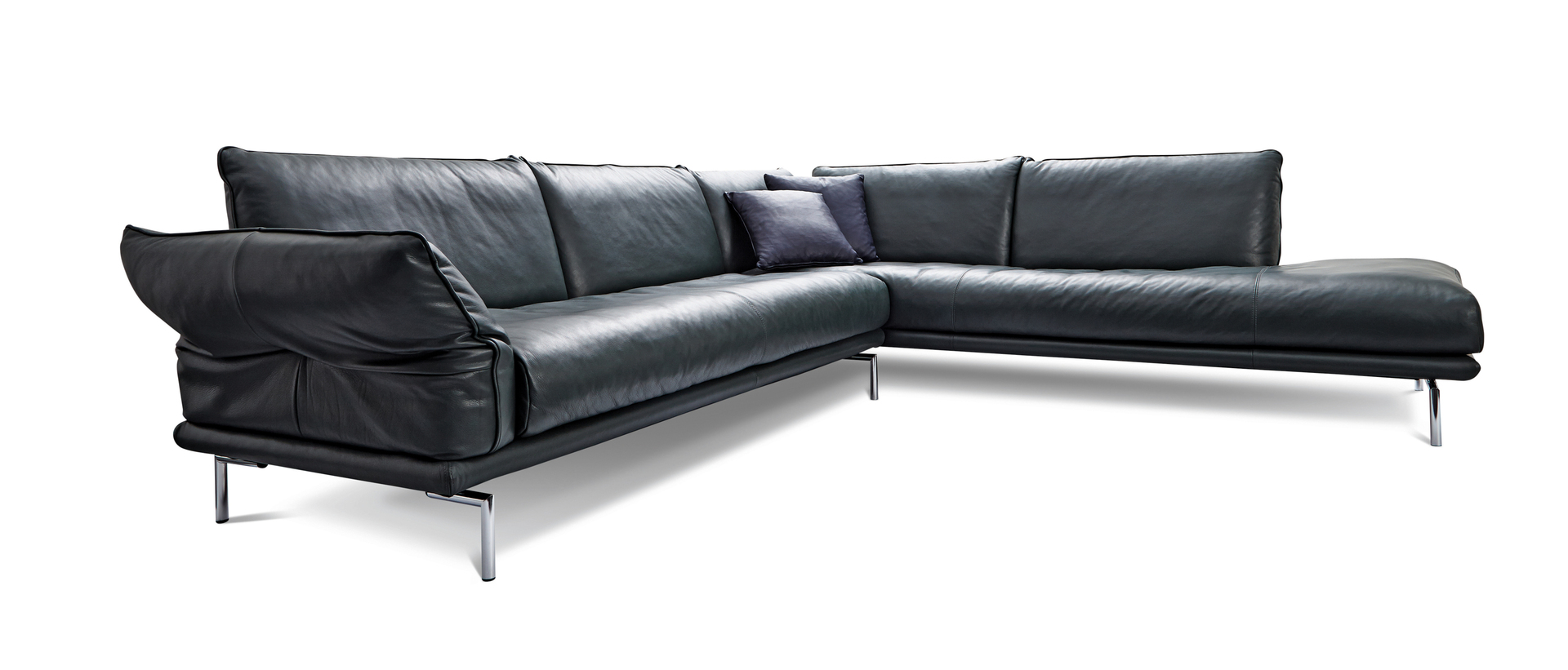 The filigree leather sofa Denver was furnished with visually appealing details. Placed on a narrow bottom panel, the seat and backrest cushions as well as the armrests give the sofa a floating lightness. This effect is enhanced by its slim metal legs. Particular attention has been devoted to the functional armrests of Denver: due to their expedient fittings, the top cushions can be flexibly moved up and down.