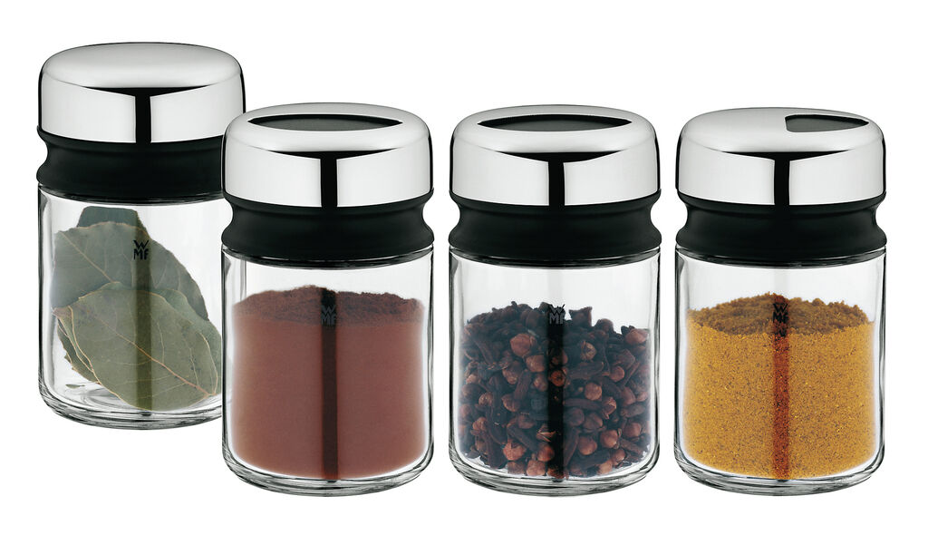 Salt, curry, peppercorns, bay leaves or cocoa are hygienically, clearly visible and properly stored in this elegant spice set. Mature in style and function, this product range includes versatile spice shakers featuring three different hole patterns: the universal shaker is suitable for ground spices, the coarse shaker was designed for coarse herbs and grains, while the fine shaker, with its fine stainless steel sieve, lends itself for paprika. However, all spices which are not crushed are packaged easily accessible in a spice jar without spread pattern. The discreet shakers and jars follow uniform lines. With their Cromargan and glass mix, they blend in well with various kitchen situations.