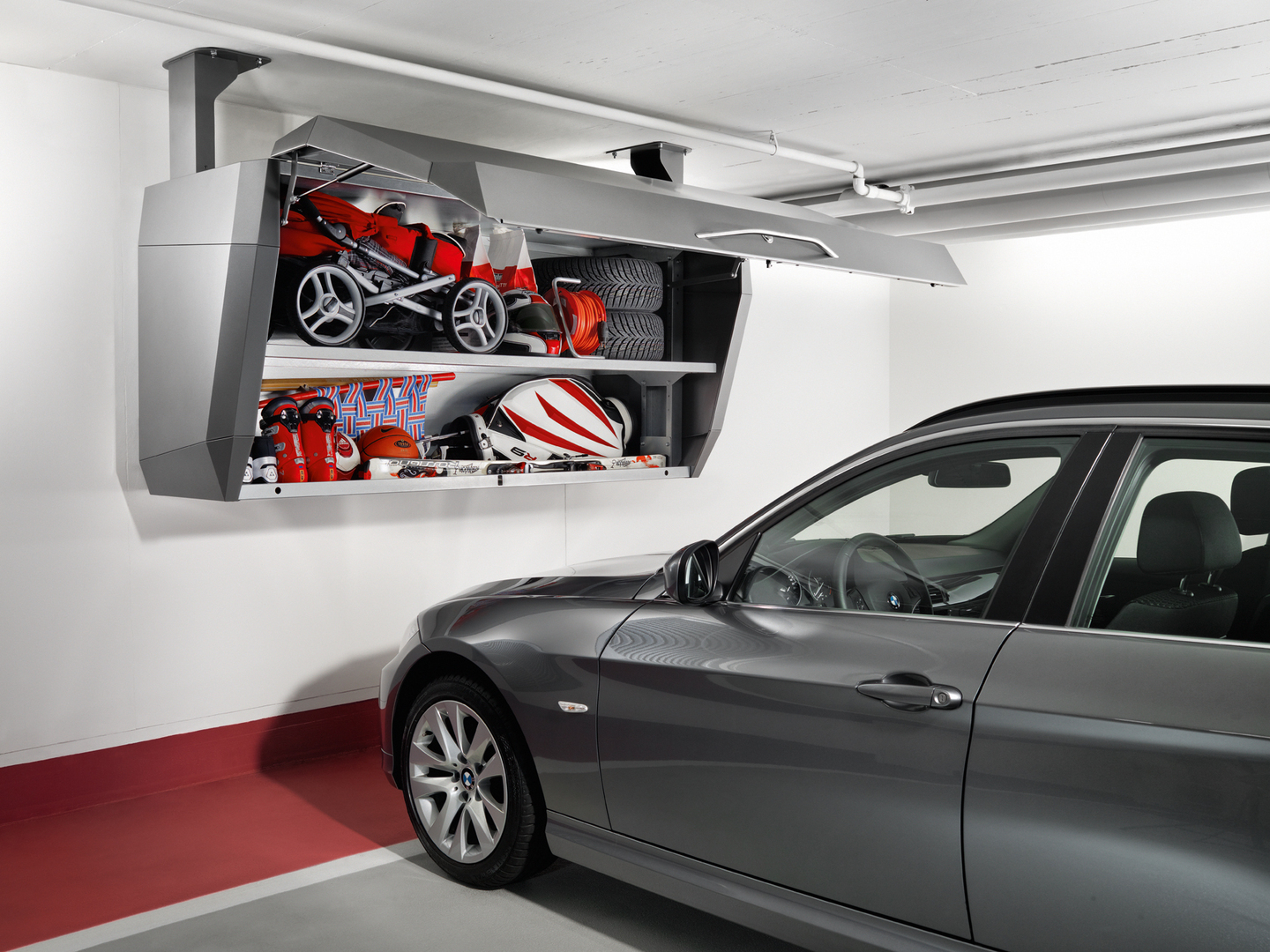 The depox is a storage box designed for garages. It offers 2 square metres of storage space with a load capacity of 250 kg directly above the car’s radiator. The innovative space-saver is designed to be mounted from the ceiling and, adjustable in height, does not limit parking space. The distinctive box is made of high-quality sheet steel and has a powder-coated surface available in a range of trendy colours.