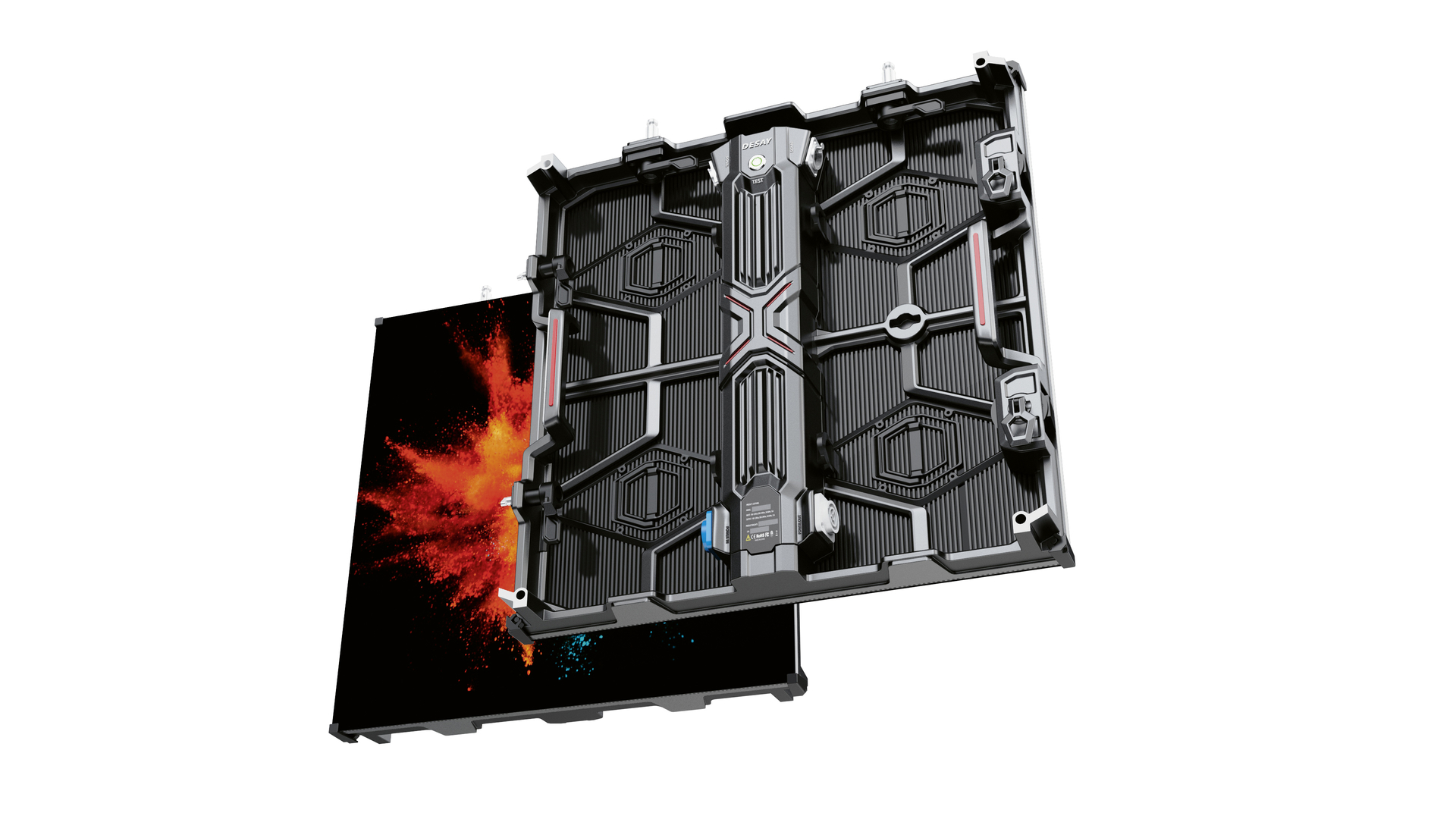 The DESAY RS series comprises high-resolution rental screens for indoor applications. Due to the special box structure and an integrated magnetic point, the modules remain shape-stable even in the event of heat development. Ergonomic locks and buttons, along with the closure in the middle of the power box, facilitate installation, while a dual power supply increases operational stability in emergencies. The RS series is characterised by a high colour performance, good heat dissipation and low noise generation.