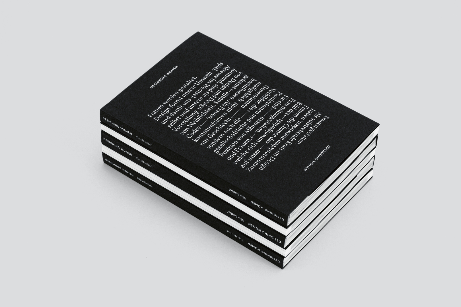 This work explores the interaction between design and society with a focus on the depiction of women. The implementation underlines the versatility of the topic by presenting a tête-bêche bound book which can be read from both sides. Starting from one side, readers first encounter the chapter “Understanding Gender”, from the other side the part “Designing Women”. The chapters “Historical Context” and “Women Design” meet in the middle. Throughout the book, the layout plays with the interaction of black and white, emphasising that the contents are inextricably intertwined both artistically and thematically.