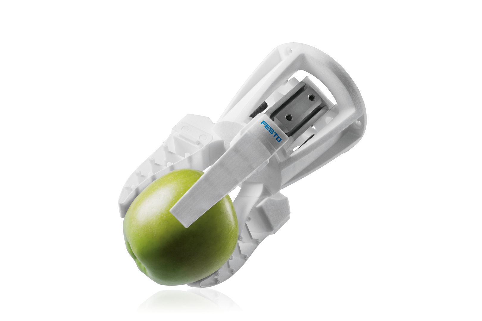 The DHDG adaptive gripper consists of a pneumatic drive in a robust basic body and three gripper fingers. The fingers are equipped with the FinRay Effect (Evologics GmbH) for reliable and non-destructive gripping of fragile materials, irregular work pieces or pressure-sensitive components. This effect is modelled after the fins of fish. The gripper is fabricated from polyamide in a selective laser-sintering process. The open design of the basic body enables space-saving integration of the gripper fingers’ movement mechanism.