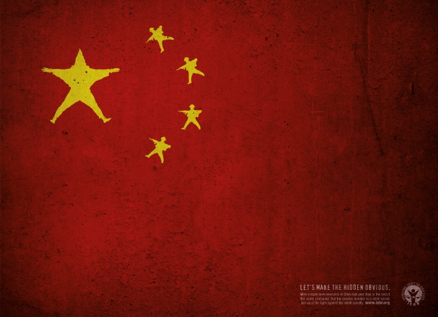 The number of executions in China exceeds the total number of executions in all other countries in the world. The objective of this strongly expressive newspaper advertisement for the Human Rights Day on December 10th is to raise the awareness that the execution of criminals and political dissidents is guarded like a state secret by the Chinese government. It subtly integrates the scene of an execution into the Chinese flag, so that, upon a closer look, this secret becomes terribly obvious.