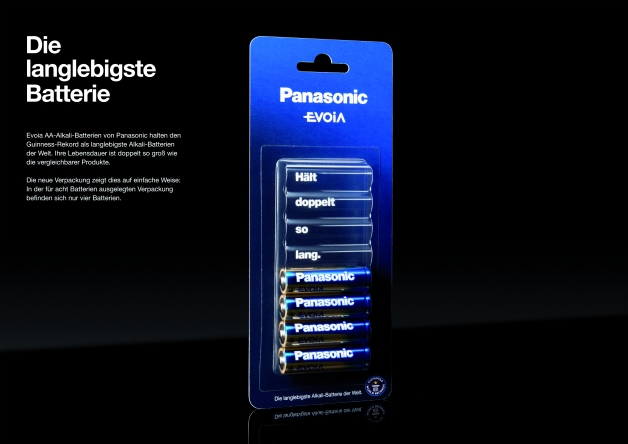Evoia batteries hold the Guinness World Record for being the alkaline batteries that provide the longest lasting power. The communication objective here was to highlight this unique selling feature to customers directly at the point of sale. The slogan “Hält doppelt so lang” (Lasts twice as long), an eye-catching message, has been printed on a half-empty package. Along with the simple concept of a surprising packaging idea, the cost efficiency of this product is demonstrated in an original way.