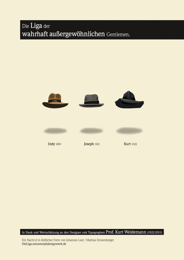 This poster was conceived as a visual obituary to express gratitude and high esteem for the late designer and typographer Prof. Kurt Weidemann. The symbolism of the depicted hats represents a direct link to his personality by displaying his hat together with the hats of Indiana Jones and Joseph Beuys. It is meant to honour his lifetime achievement and communicate that, aside from his professionalism, Kurt Weidemann was known for his impressive personality.