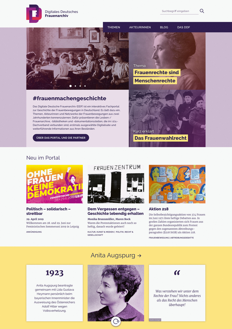 The new web portal of the Digitales Deutsches Frauenarchiv (Digital German Women’s Archive) presents an overview of the issues, biographies and achievements of the German feminist movement, spotlighting how much it took to overcome obstacles. An attractive layout and responsive web design deliver interesting content to researchers and students. They can navigate through a relationship network and taxonomies to find material relevant to them, with individual topics explained briefly. A faceted search guides the user through over 500,000 objects. Digital images and multi-page publications can be viewed in high resolution.