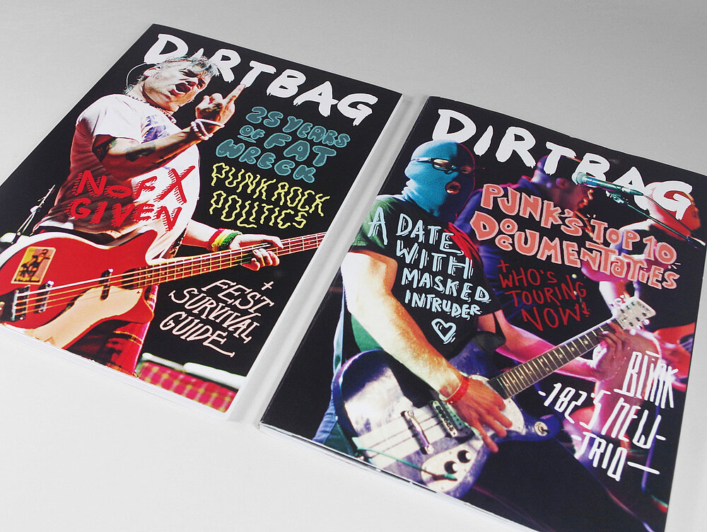 Dirtbag is a punk rock music publication which celebrates the genre and subverts the stigma associated with it. The magazine focuses on established figures in the scene, shares tour information and highlights up-and-coming artists. Staying true to a zine-esque DIY feel which is associated with punk culture, playful hand-lettering and pops of colour tie the spreads together. When designing the magazine, use was also made of numerous colour and black-and-white photos. Surprise posters and stickers can be found within each issue to help establish a brand following and encourage people to talk about punk-rock.