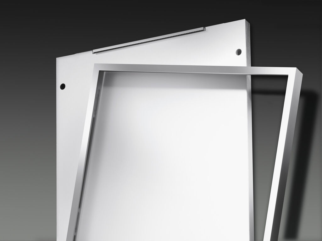 The base element of the Display Magnetic Frame (the back of the frame) is securely bolted to the wall. The actual profile frame and the plexiglass are magnetically placed onto this base element as a single unit thanks to the new Glasfix system. That makes opening the frame child’s play. The second element is the specially developed Posterfix module, built into the base element that is bolted to the wall. Simply slide in the poster from below and it will automatically be held in place by the clever clamping mechanism.