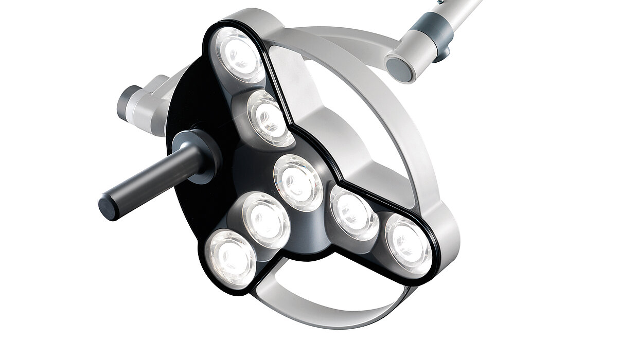 The Dmed visano LED examination light provides a homogeneous light field at an illumination of 60,000 lux. The luminaire’s concave-shaped head with its 360-degree turnover axis provides a favourable concentration of light. Thanks to the diamond-shaped lenses with 365 fine ridges each, the light is optimally refracted. Spring-balanced joints that remain in position provide safety and ease of use.