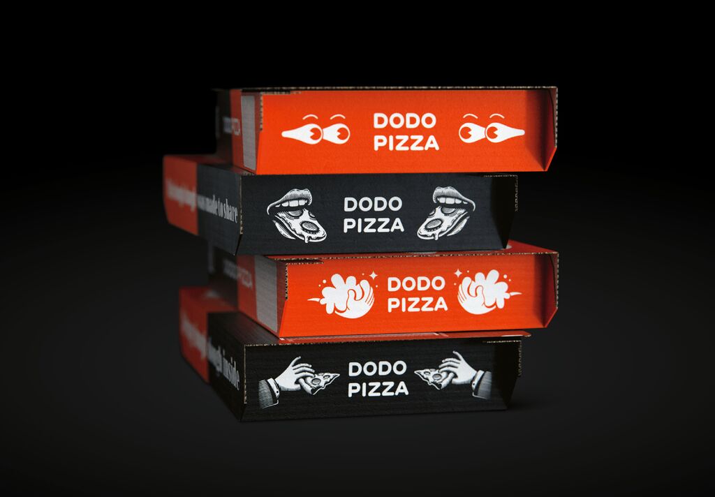 Dodo Pizza is a fast-growing restaurant chain in the UK, which is a very competitive market for pizza providers. Accordingly, the new brand design aims to clearly distinguish itself with a new brand positioning and distinctive communication with the target group. A memorable tongue-in-cheek visual language was created, combining self-explanatory imagery with bold colours. The two-syllable word mark on a black and red background has a playful illustration style that suggests an appetite for a pizza. The brand design was implemented on pizza boxes, delivery packages and cars, merchandise for employees and the shop window.