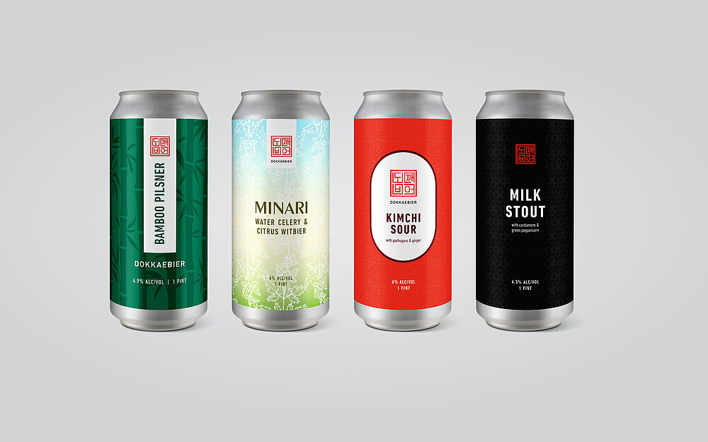 The brand design for Dokkaebier, an innovative craft beer with Asian ingredients, is inspired by the dokkaebi, a shape-shifting creature from Korean folklore. The focus was on developing a distinct logo and visual identity that highlights the playful spirit and Korean influence behind the brand. The logomark draws on the Korean alphabet and traditional seals, while the brand’s spirit is communicated through a set of faces without a distinct body shape. The labels feature illustrations and icons to inform consumers about the different flavour profiles. The packaging differentiates between experimental brews (white labels) and core beers (coloured labels).