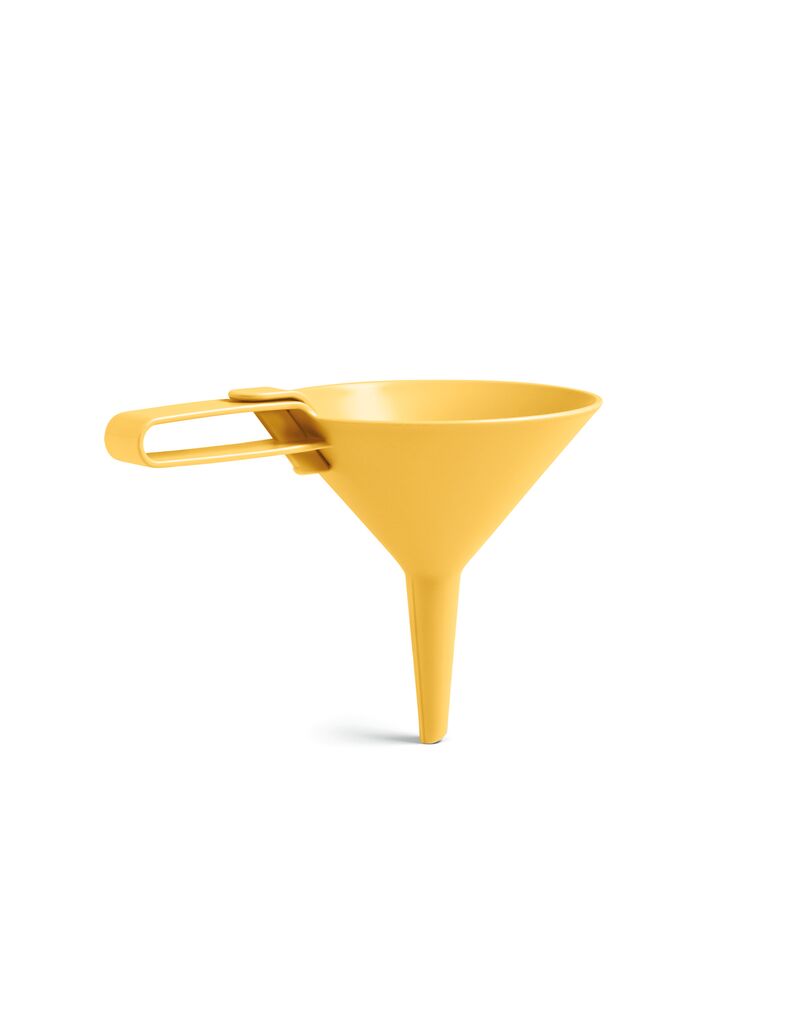Dolina is a funnel equipped with a removable cap whose lever is positioned above the handle so that it can simply be operated with the thumb or forefinger. Thanks to this cap element, made entirely of recyclable polypropylene and rubber, the flow of liquid can be individually regulated. The rigorous design approach of this easy-to-clean funnel is revealed in the thick walls that bypass the need for reinforcing edges and grooves.