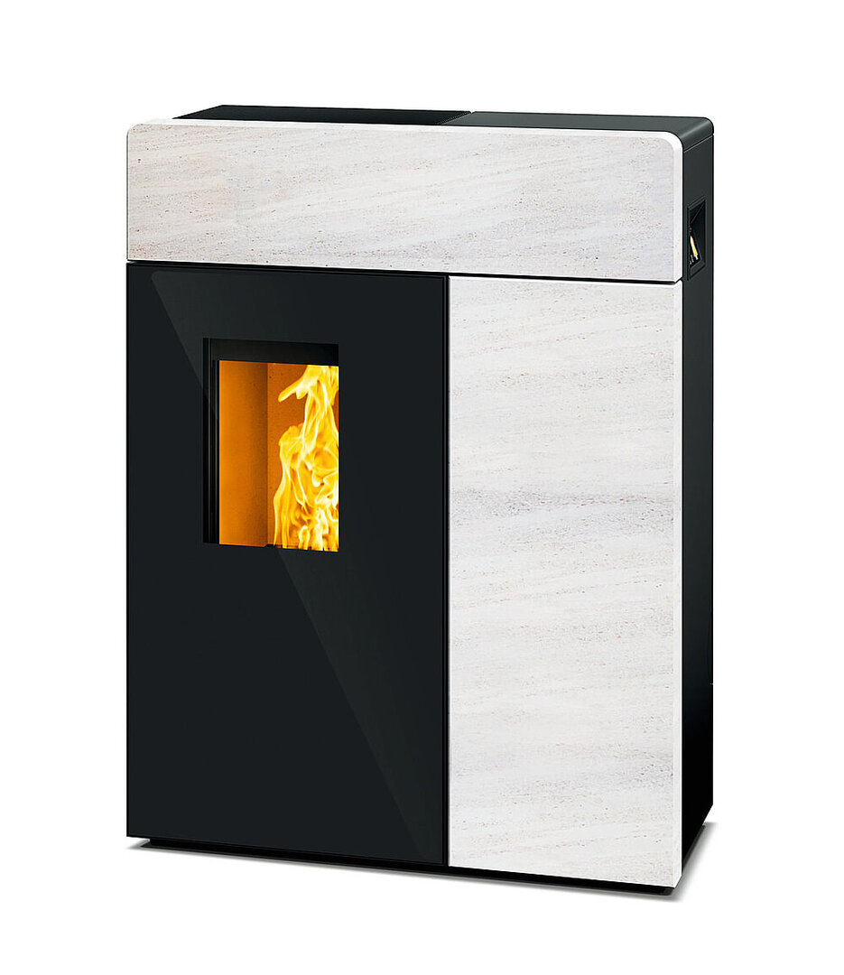 Clean lines highlight the exciting contrast between the black steel body and the lighter coloured stone cladding of the DOMO pellet stove.